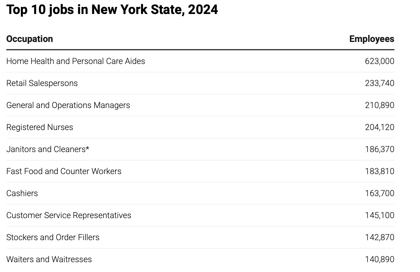 Over this period, the job category of home health aide has become far and away the largest job category in New York State. Here is a chart from the Empire Center Report, derived from BLS data, of the largest job categories in New York in 2024:
