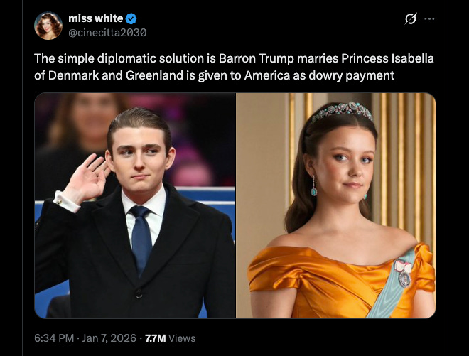 The Donroe Doctrine: As far as Greenland is concerned, overwhelming military force should always be the first option for acquiring new territory. But that doesn’t mean Trump shouldn’t explore a less aggressive option that often succeeded in settling international disputes until the feminists started complaining.